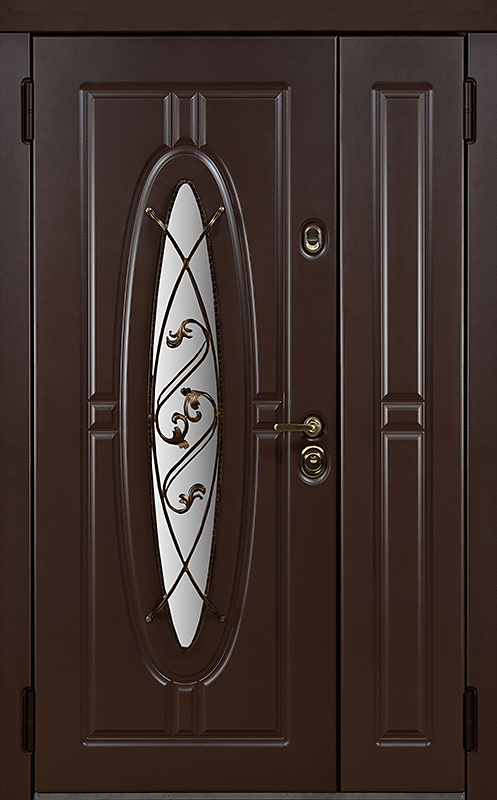 Двойная уличная дверь с овальным стеклом и художественной ковкой №14 — это уникальное сочетание функциональности и эстетики. Панели МДФ с ПВХ-покрытием, используемые как для внешней, так и для внутренней отделки, обладают высокой стойкостью к внешним воздействиям, сохраняя свой внешний вид на долгие годы. Внешний декор в виде художественной ковки придаёт двери особый шарм, подчеркивая её стиль и индивидуальность. Двойная уличная дверь с овальным стеклом и художественной ковкой №14 от производителя: быстрое изготовление и монтаж в Реутове, индивидуальные размеры, широкий выбор материалов и фурнитуры, официальная гарантия до 10 лет.