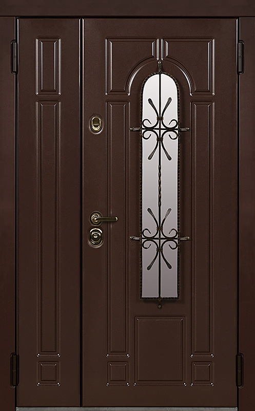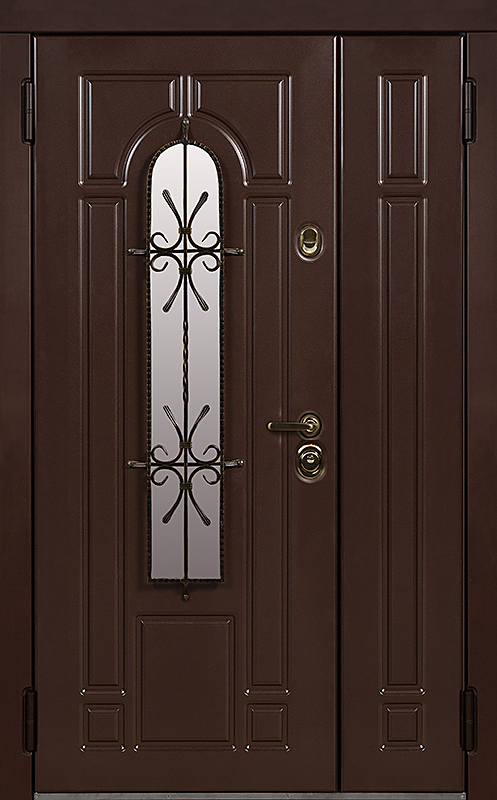 Эта металлическая двухстворчатая дверь с арочным стеклопакетом №15 представляет собой идеальный баланс между эстетикой и прочностью. Арочное стекло добавляет в её дизайн утончённость, а ковка в декоре придаёт изысканный, но в то же время крепкий и надёжный вид. Плита МДФ, используемая как для внешней, так и для внутренней отделки, не только сохраняет прекрасный внешний вид, но и устойчива к механическим повреждениям. Металлическая двухстворчатая дверь с арочным стеклопакетом №15 от производителя: быстрое изготовление и монтаж в Реутове, индивидуальные размеры, широкий выбор материалов и фурнитуры, официальная гарантия до 10 лет.