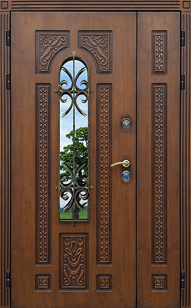 Двойная входная дверь с большим стеклом и ковкой для дома №25 сочетает в себе стиль и надежность, предлагая великолепное решение для вашего дома. Внешняя и внутренняя отделка выполнены из панелей МДФ с ПВХ, что придает двери долговечность и устойчивость к механическим повреждениям, а также способствует легкости ухода. Стеклопакет в комбинации с изысканным кованым узором создаёт не только эстетическое наслаждение, но и позволяет улучшить светопроникновение в помещении. Двойная входная дверь с большим стеклом и ковкой для дома №25 от производителя: быстрое изготовление и монтаж в Реутове, индивидуальные размеры, широкий выбор материалов и фурнитуры, официальная гарантия до 10 лет.